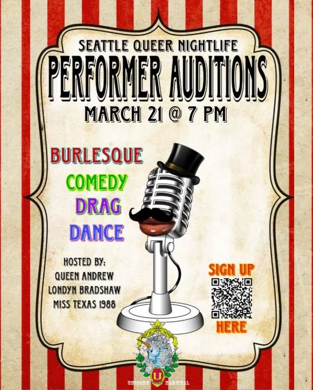 We are so excited to announce that Unicorn is this years venue for the Seattle Queer Nightlife Performer Auditions. To sign up follow the QR code, this is an open show for any Drag Performers, Burlesque Performers, Comedians, Dancers and Singers that are new to the scene.